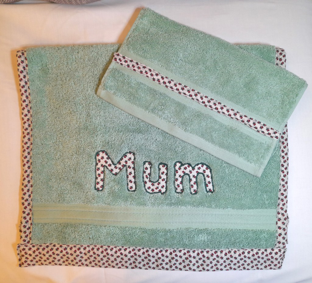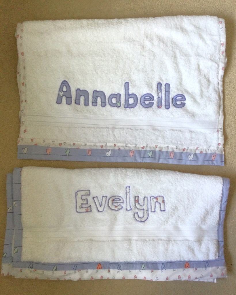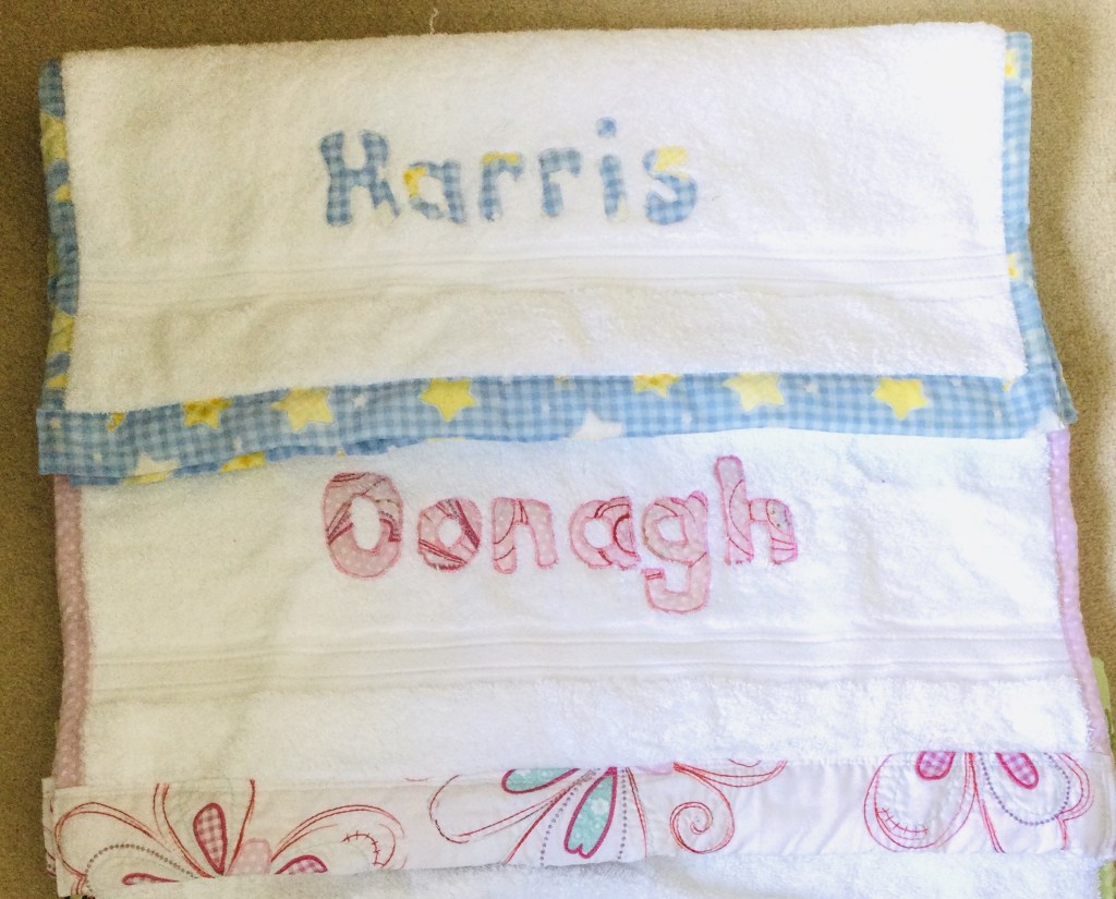 Towels are edged in attractive fabric with appliqued lettering